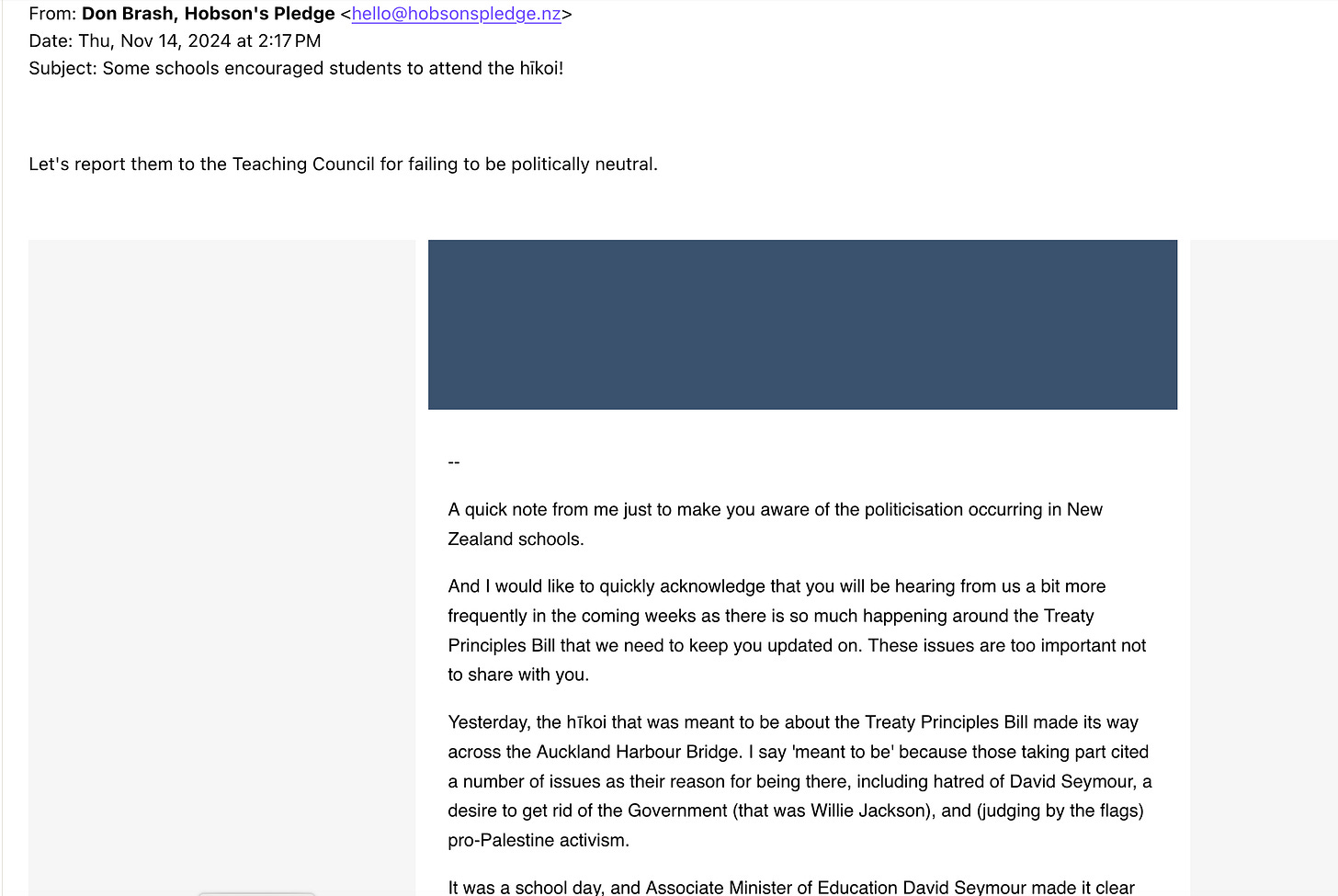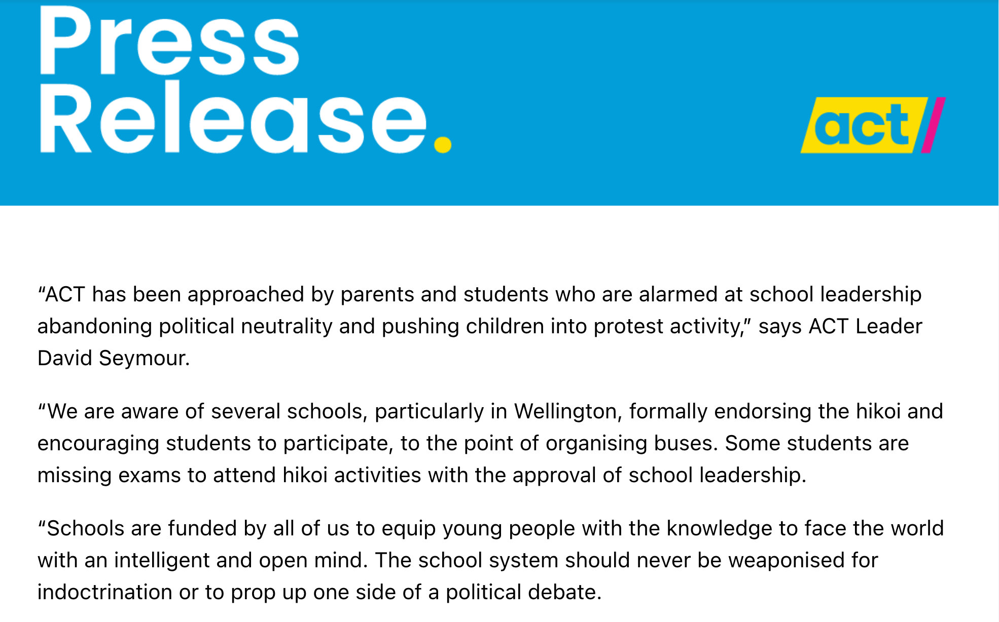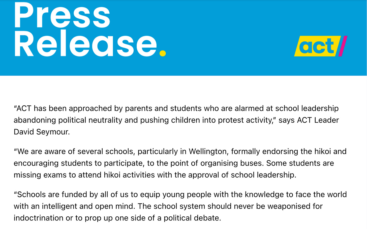 Or just David Seymour politicising children and education by instructing the Ministry of Education to issue orders that schools effectively not support the Hikoi or risk consequences. The Secondary Principals Council head said Seymour “casting aspersions over schools' neutrality on a political issue was unprecedented.” (Let alone extraordinary for its authoritarian direction.)