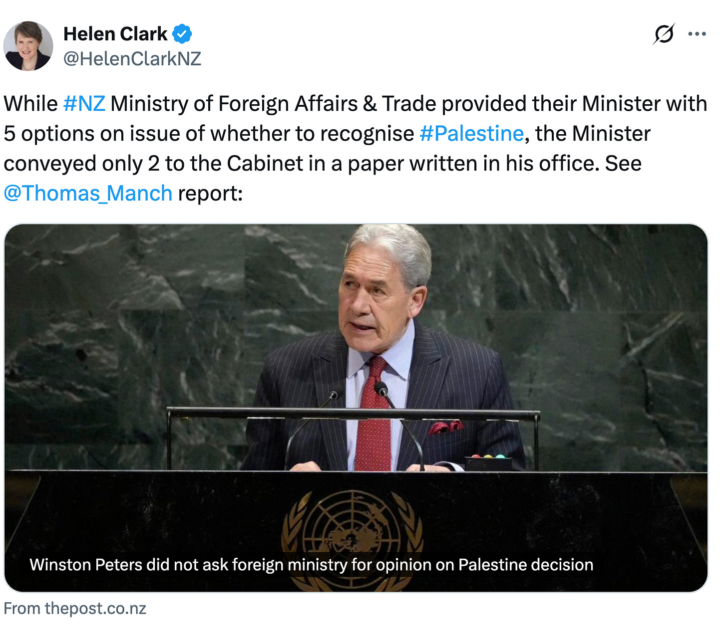 “While the [Palestine statehood] decision, made by Cabinet earlier this month and announced by Peters at the United Nations on Saturday, was informed by advice provided by the Ministry of Foreign Affairs and Trade (MFAT), Peters’ own staff wrote the crucial Cabinet paper which [kept] two [of five MFAT] options.
