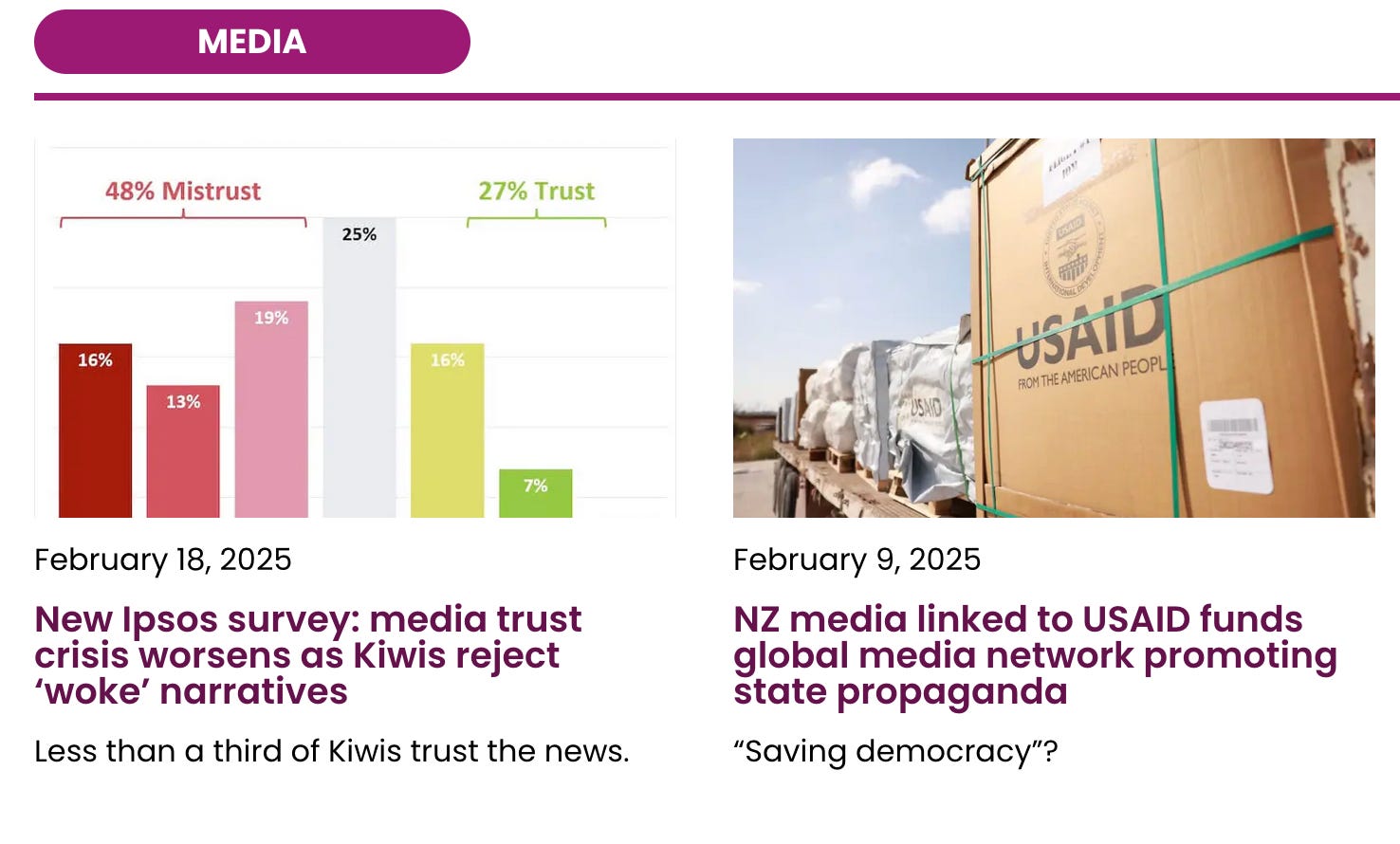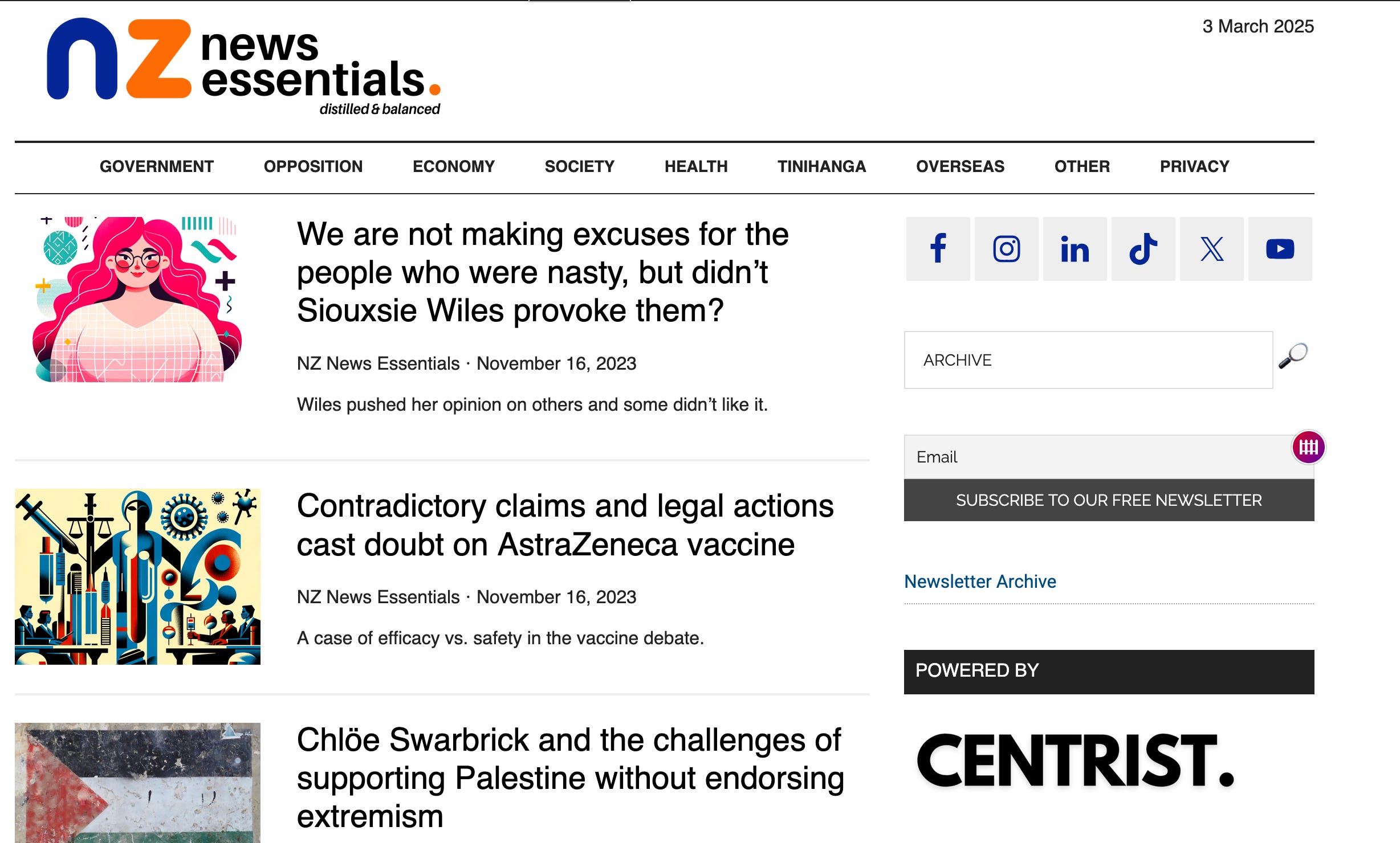 That appears to be now rebranded as Centrist NZ, which appears to include interesting headlines mocking anti-Treaty Principles Bill witnesses, may exacerbate transgender concerns, and suggests New Zealand media promotes ‘state propaganda.’