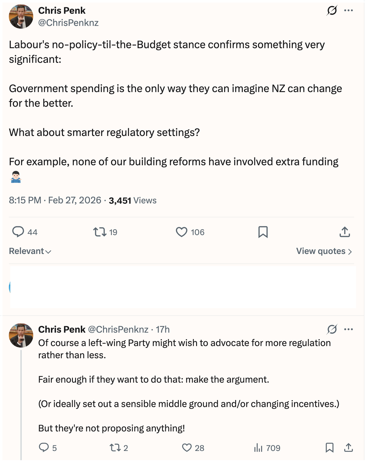 Housing Minister Chris Penk was at it again yesterday, lamenting that Labour haven’t released enough policies for National’s liking.