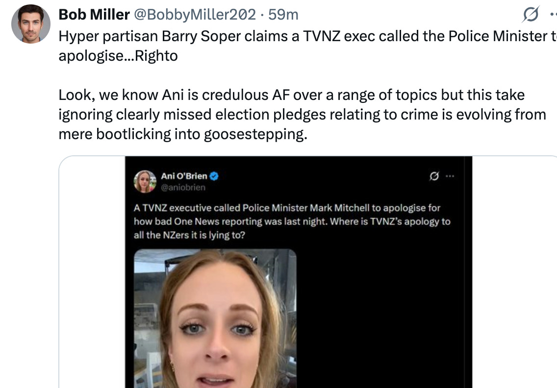 The word going around the grapevine from right wing figures is that a TVNZ executive personally called Police Minister Mark Mitchell to apologise for this week’s report that gang numbers now surpass police numbers.