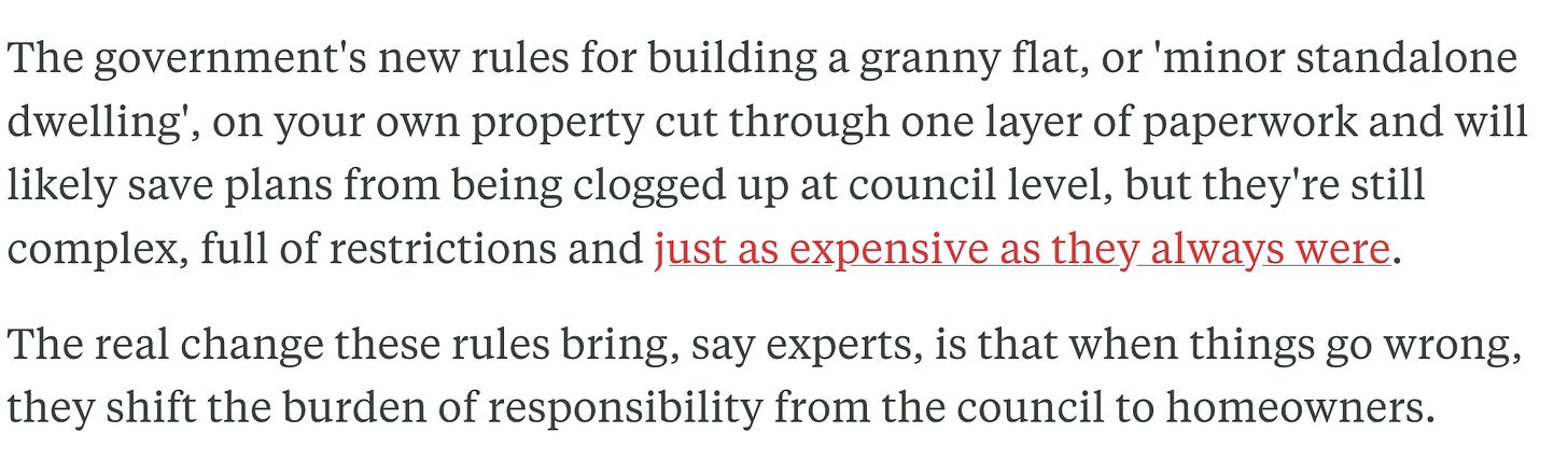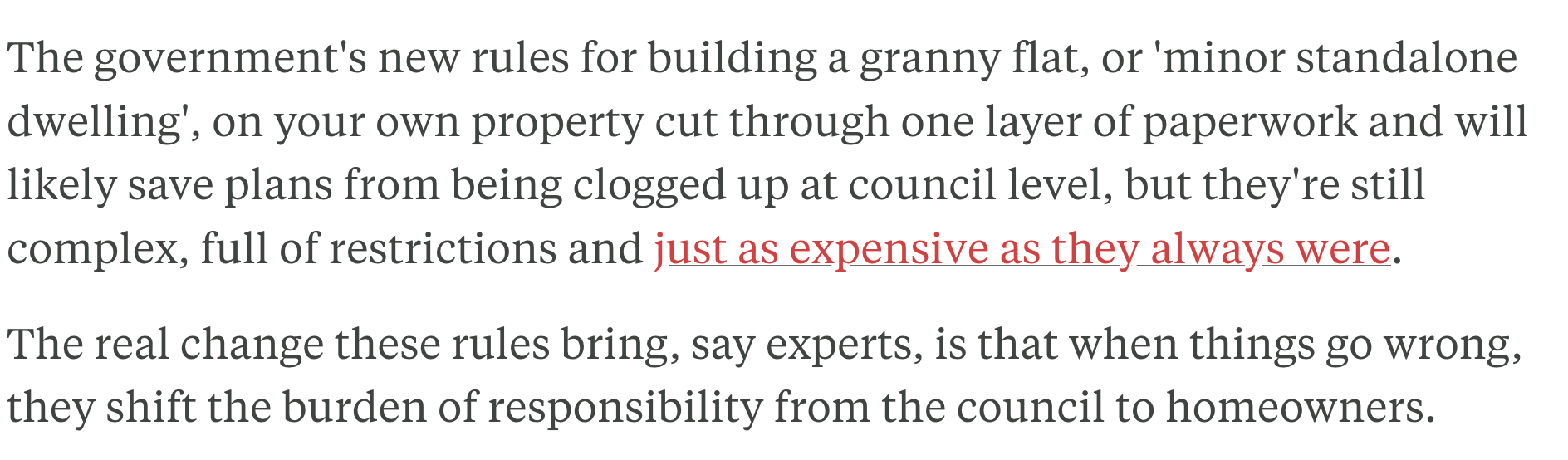 Before we get into this, let’s take a moment to thank Minister Chris Penk for spending over two years to come up with a granny flat law that experts say is no cheaper, still complex & now shifts any problems from councils onto homeowners.