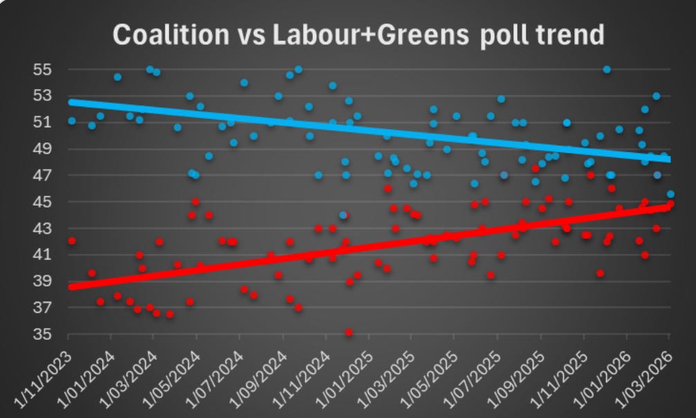Victoria Director Consulting’s Smith also notes that Labour and Greens alone are closing ranks on the Coalition.