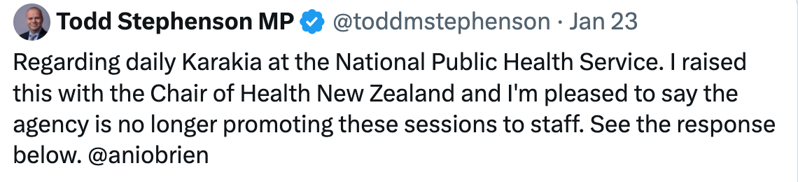 In response, ACT’s Todd Stephenson took it upon himself to help “Ani” by writing to Health NZ Chair Lester Levy, and upon Lester “Chainsaw” Levy confirming karakia has always been entirely voluntary, posted a note posturing that he had had something to do with this fact.
