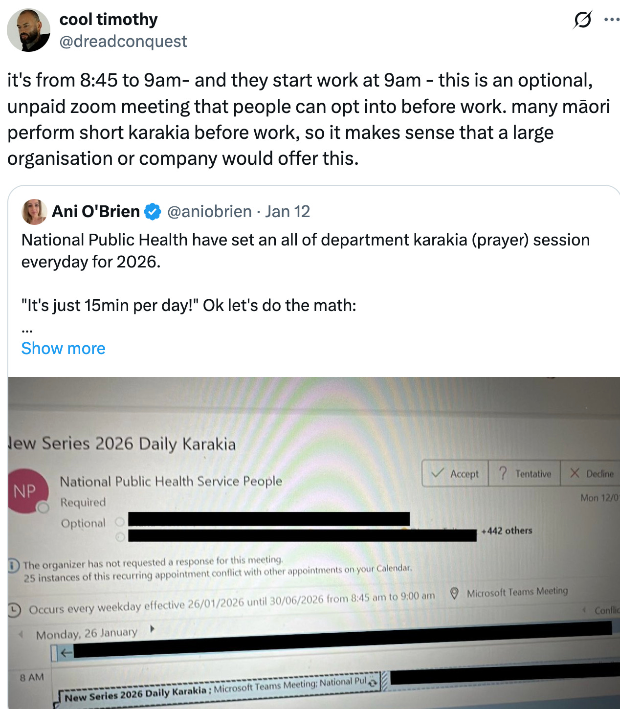 And right wing agitators such as Ani O’Brien have been stirring up acrimony, using optional, voluntary, pre-work karakia in Health NZ as an example of “public service waste” and claiming it costs NZ taxpayers $1 million, which is frankly an absurd allegation.