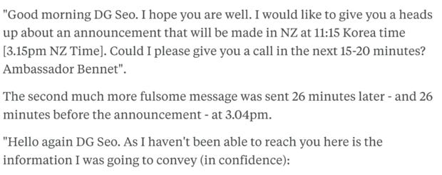 Today, RNZ revealed that despite MFAT advice to Nicola Willis to be very “careful and deliberate” in her communications with the South Korean government, prior to any public announcement on cancelling Kiwirail’s i-Rex, they instead told South Korea 26 minutes before-hand