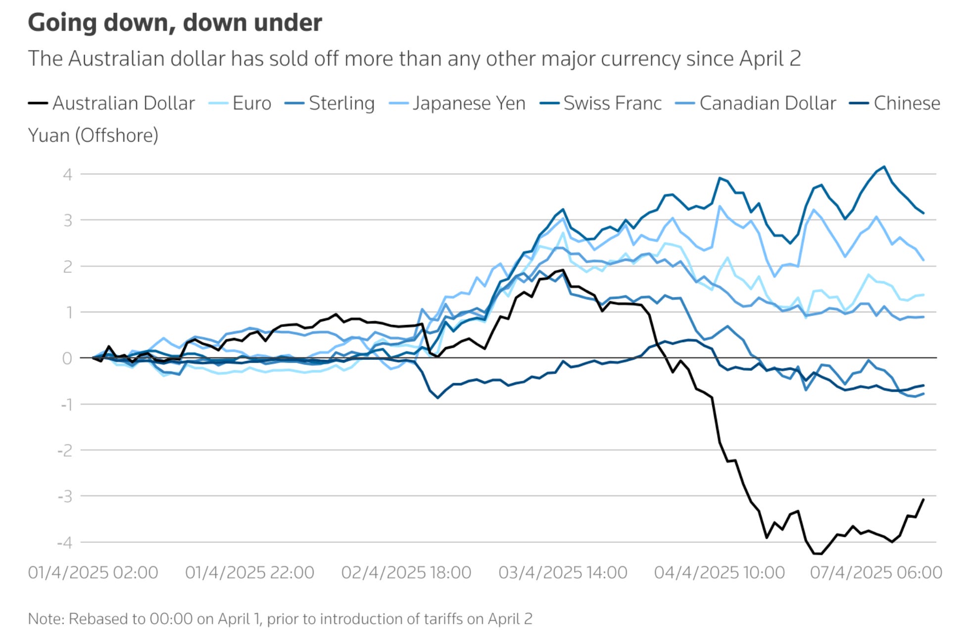 Australia’s currency has shed 4.5% of its value in two days, despite it being on the receiving end of one of the lesser tariff rates, 10%. It’s the largest currency sell off since 2020 (Covid).