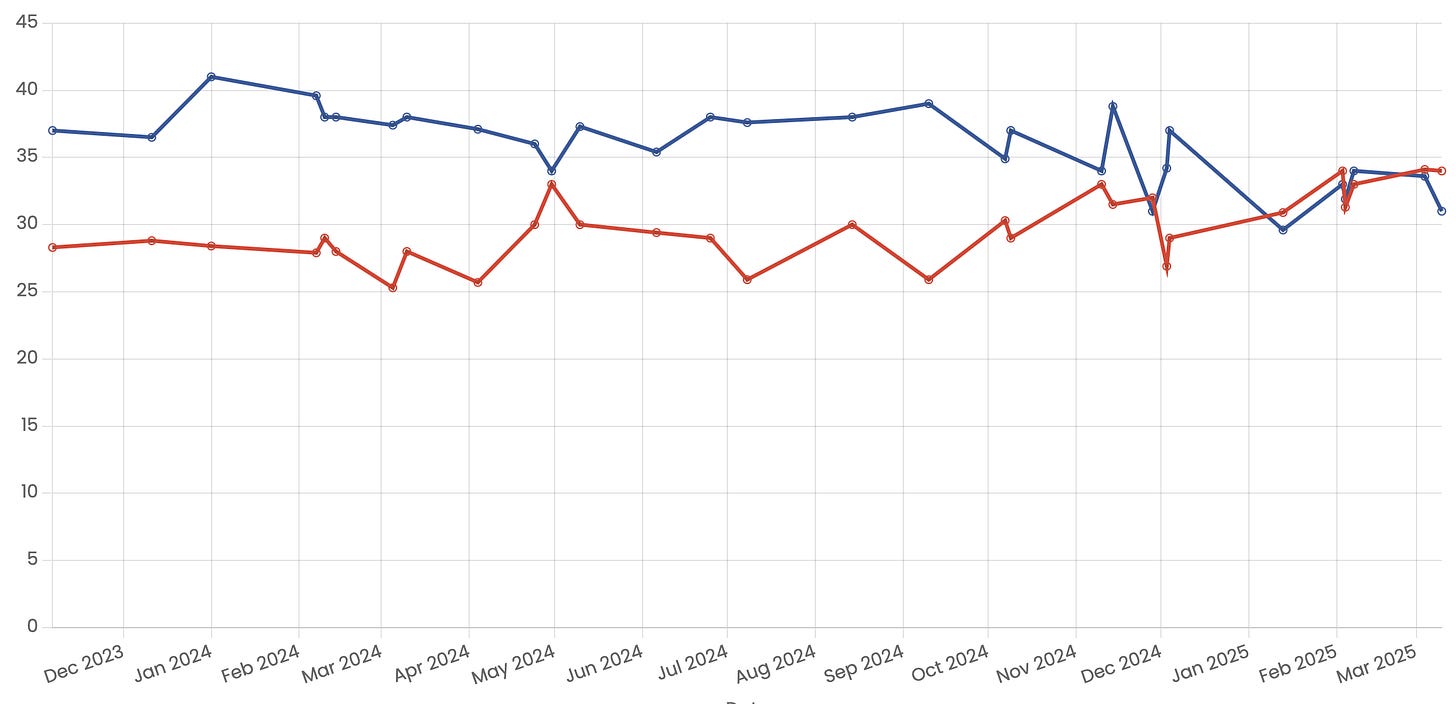Pictures Tell The StoryHere and GloballyMountain TūīMar 17, 2025∙ Paid9047ShareCorrected from 2023 in earlier articleNational held its ground until late 2024Verion, Talbot Mills & Curia Polls (Red = Labour, Blue = National)If we remove outlier results from Curia (National Party November 2024) National started trending down in October 2024.This post is for paid subscribersSubscribeAlready a paid subscriber? Sign inPreviousNext