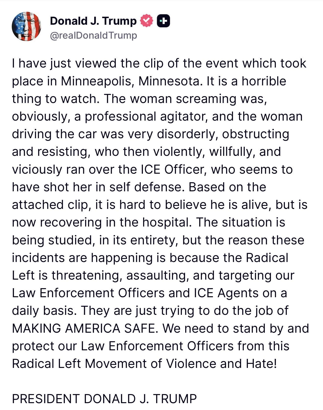 Kristi Noem, USA’s Secretary for Homeland Security, slammed Good a “domestic terrorist” and Donald Trump taunted Good as a “professional agitator”, apparently before her body was even removed, calling it “self defence”.