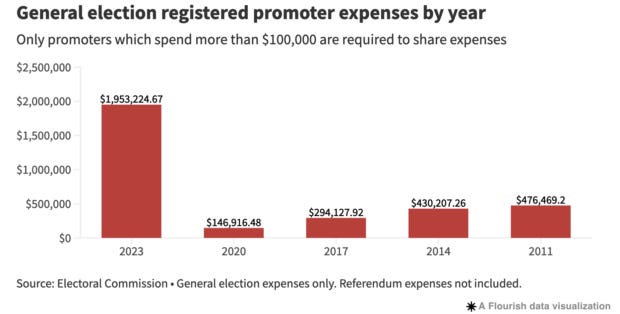 In the 2023 electoral year, National raised $10.3 million, more than doubling the $4.7m raised by Labour.