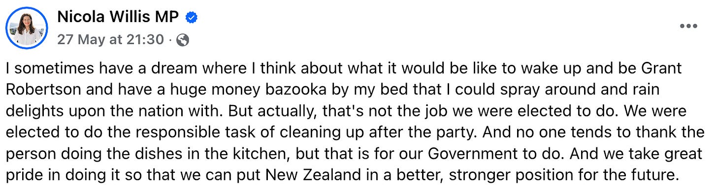 Yesterday Nicola Willis posted an odd social media post suggesting she is a diligent, responsible Finance Minister versus Grant Robertson, who she suggested, had a “huge money bazooka” which he “sprayed” indiscriminately.